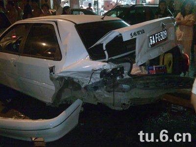 第7撞 夫妻瞬间阴阳相隔 从孕妇死亡处向前数十米,记者来到金盛路888号一家超市门前。停在路边的一辆白色富康轿车已经少了一个角和一个轮子。在这个超市门口,一名年轻的丈夫和他的妻子刚走出超市,来到路边,丈夫随即当场失去生命。他买的东西散落了一地。